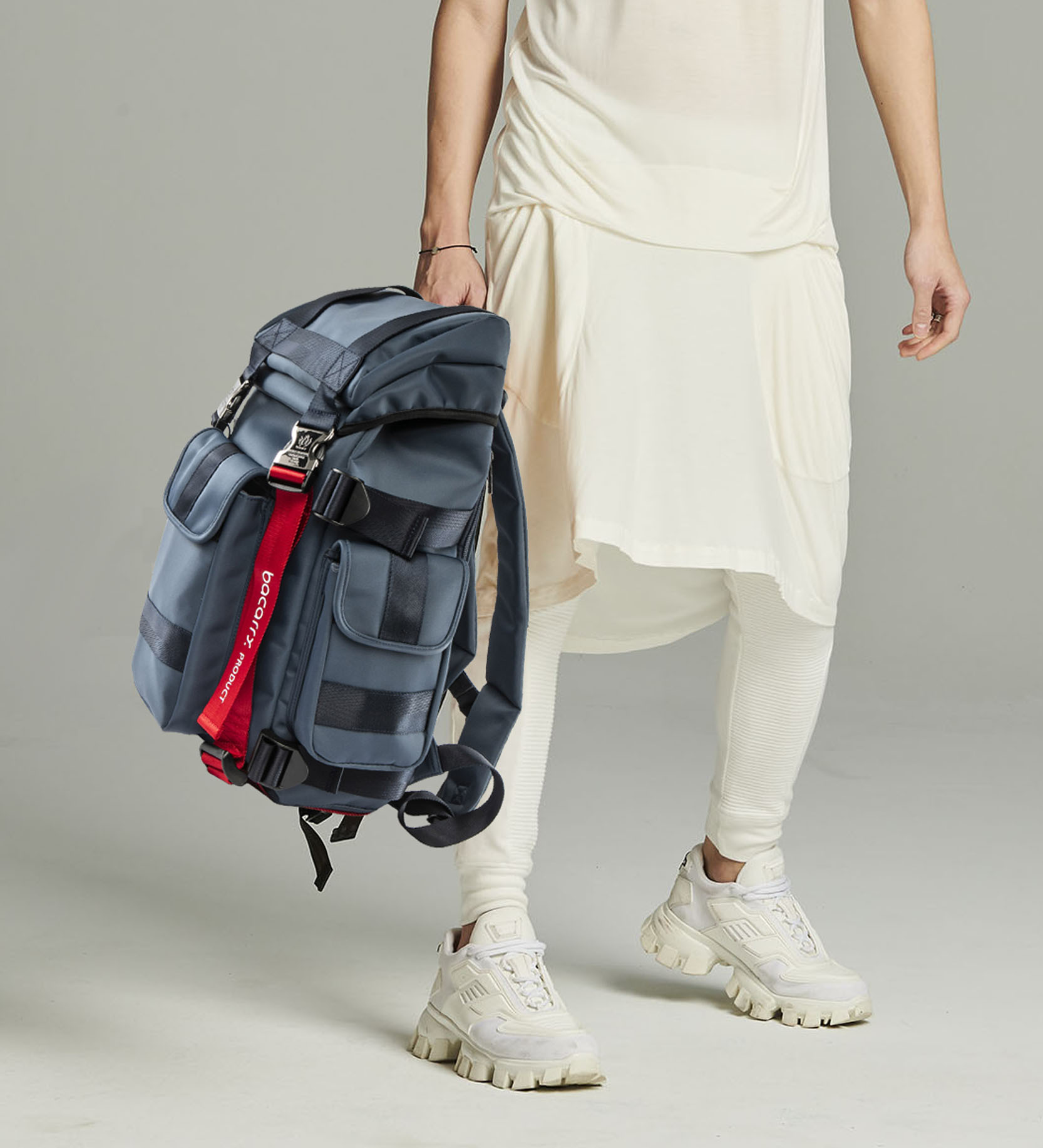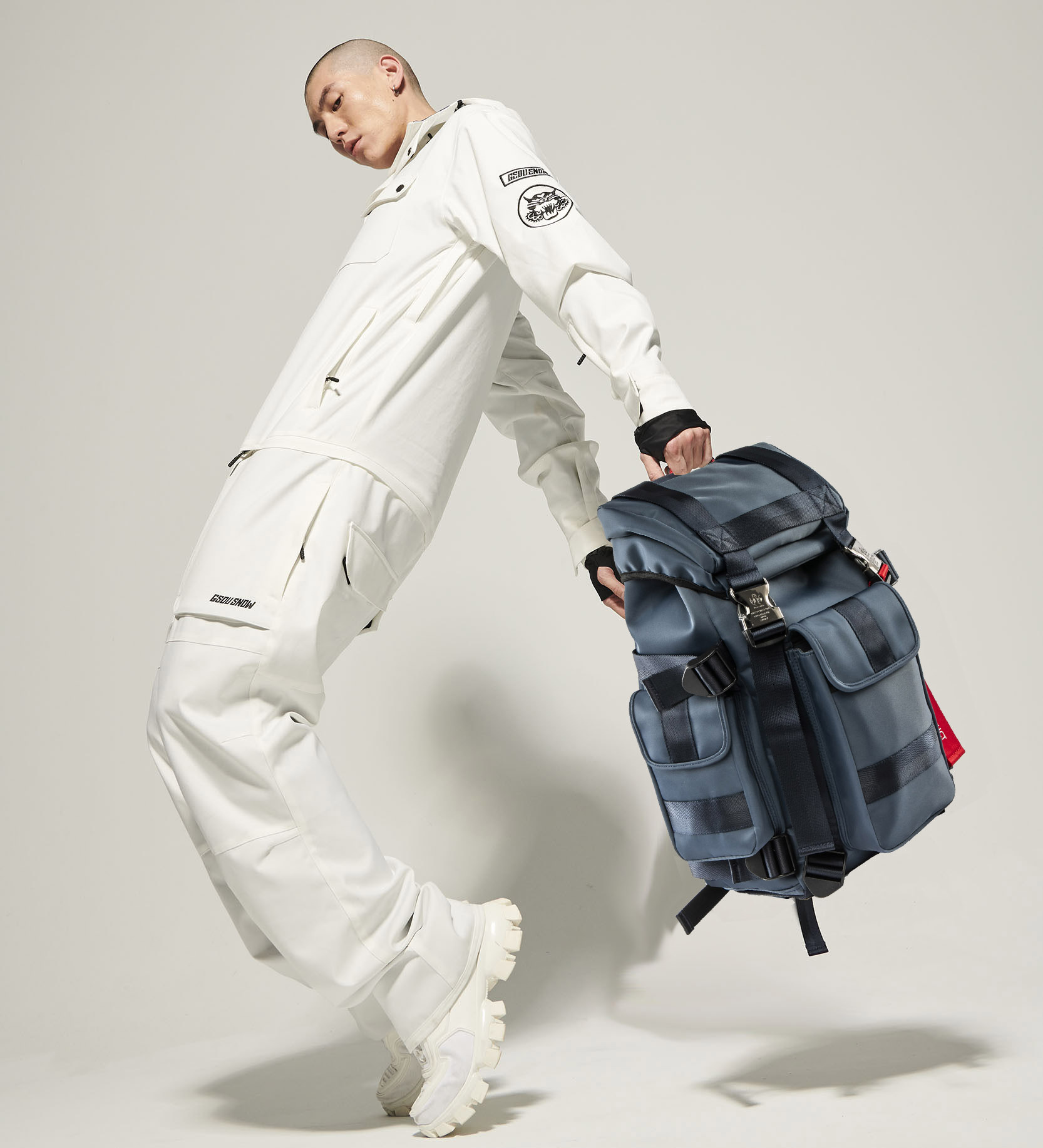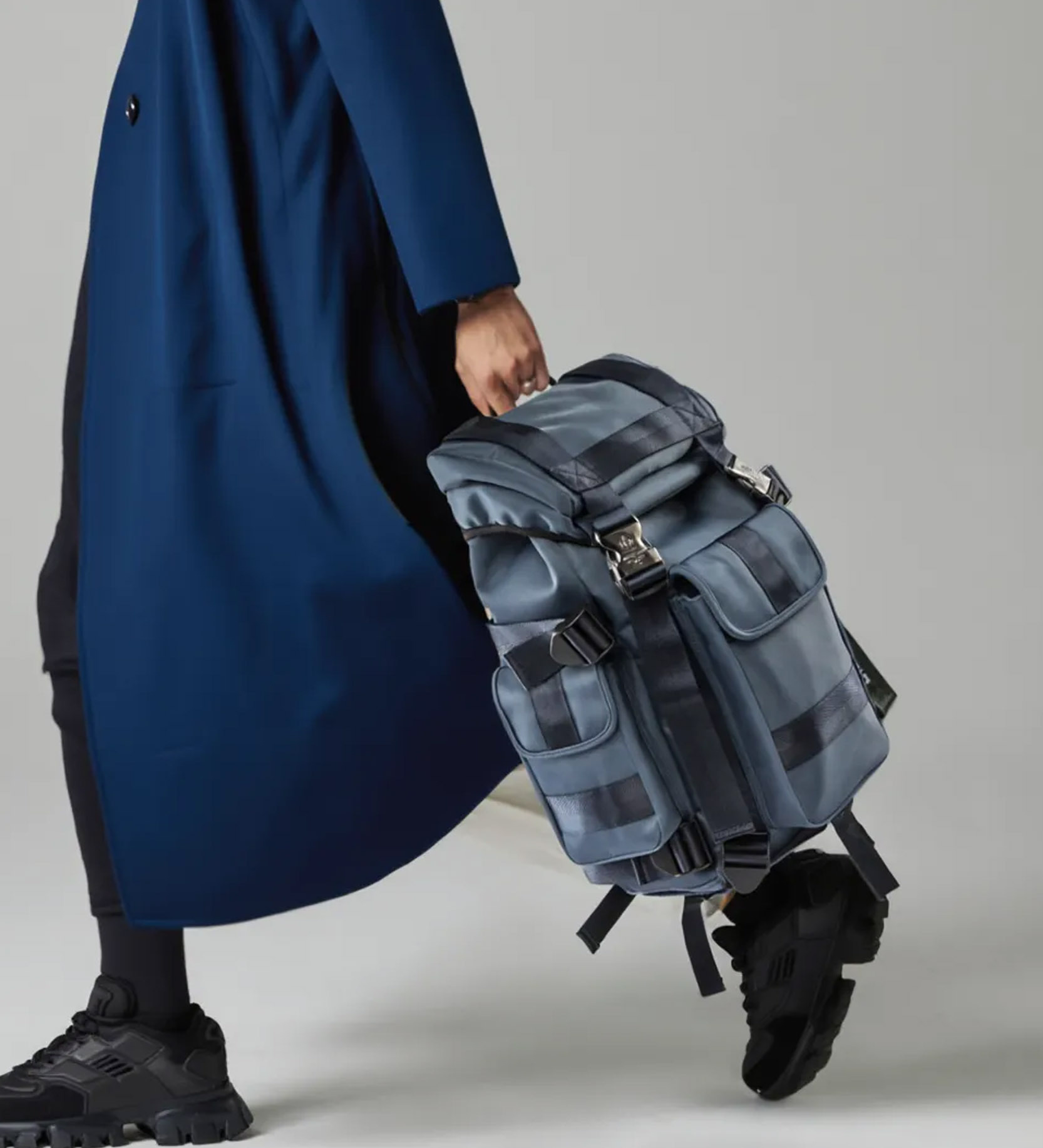 織帶與布料尋求不同的光影來堆疊的表現方式,包身上的外置大口袋更可以滿足旅行的