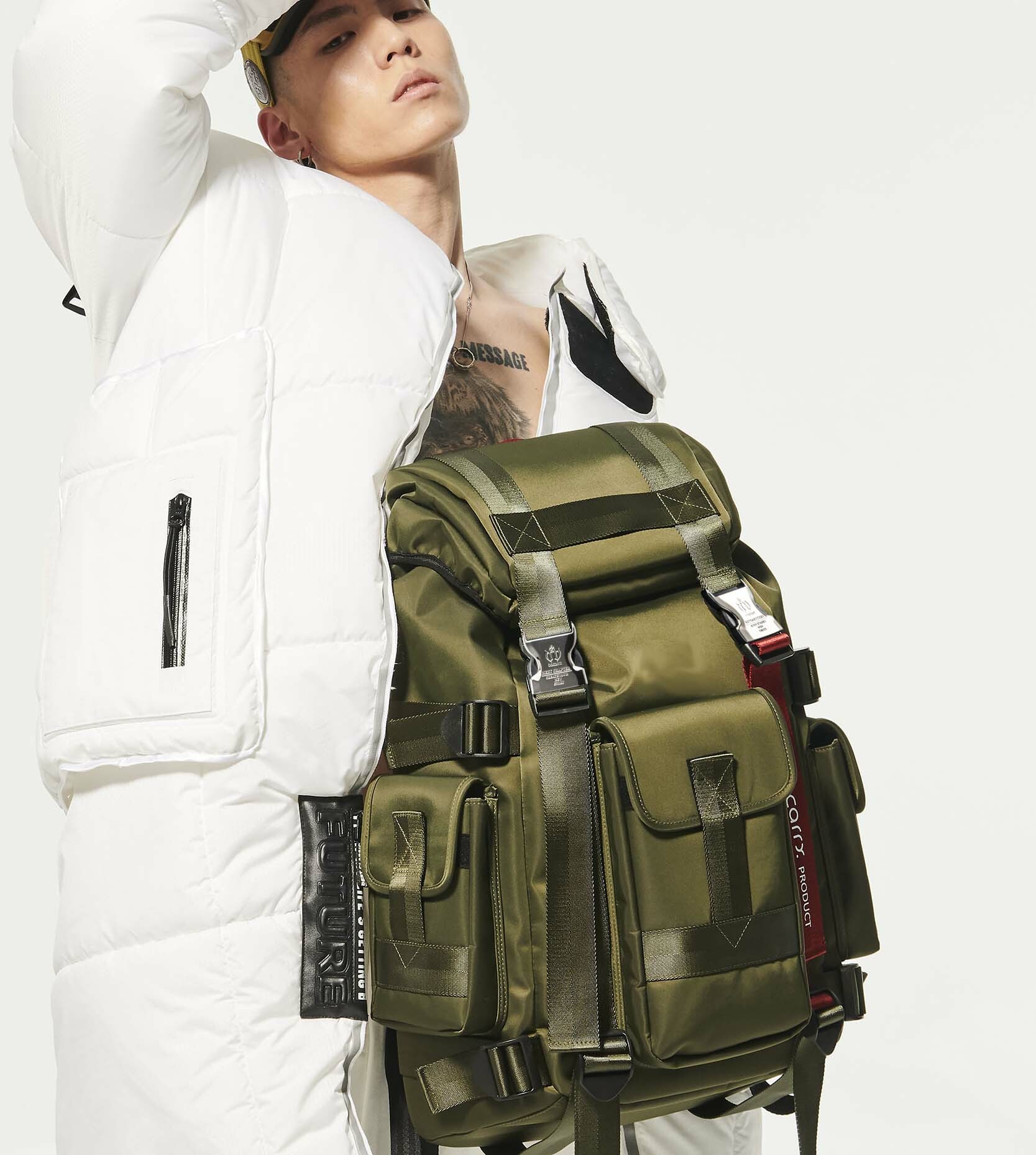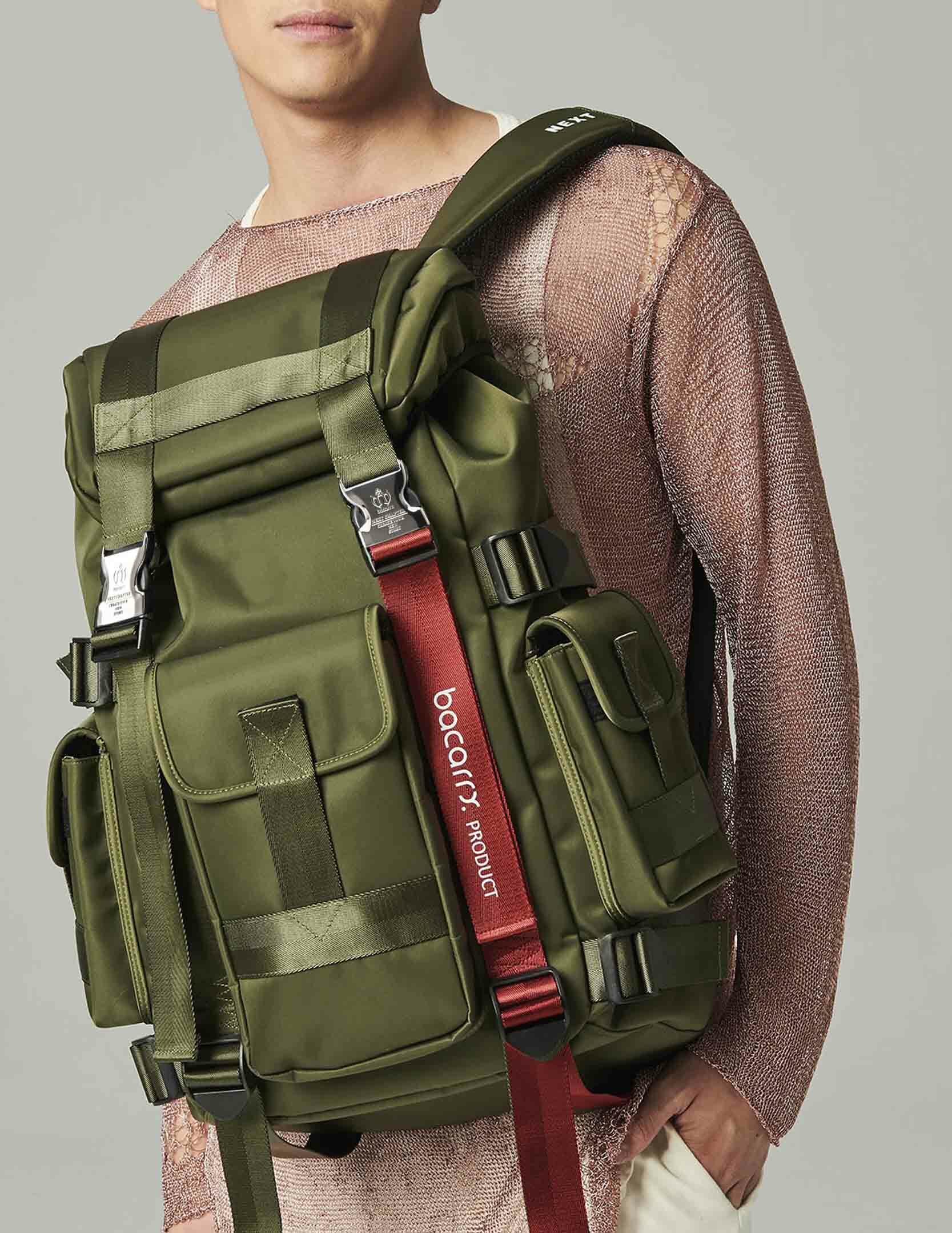織帶與布料尋求不同的光影來堆疊的表現方式,包身上的外置大口袋更可以滿足旅行的